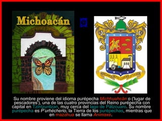 El documento describe la historia, geografía y cultura del estado mexicano de Michoacán. Se menciona que Michoacán significa "lugar de pescadores" en purépecha y que la capital, Morelia, fue fundada en 1541. El estado se caracteriza por su riqueza ecológica y cultural, incluyendo artesanías, gastronomía y tradiciones únicas.
