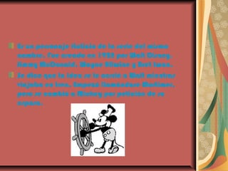 Mickey Mouse es un personaje ficticio creado por Walt Disney en 1928 que apareció por primera vez en la película Steamboat Willie. Mickey se ha convertido en el icono más reconocido de Disney y ha protagonizado numerosas películas cortas y series de televisión. Actualmente su voz es interpretada por Bret Iwan y aparece en muchos videojuegos como protagonista.