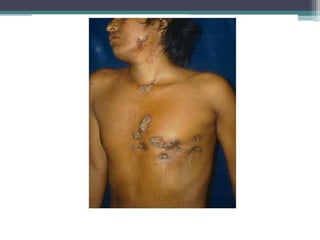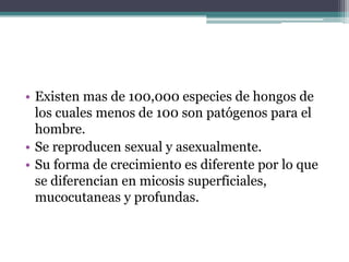 Este documento describe la histoplasmosis y la coccidioidomicosis, dos micosis profundas causadas por hongos. La histoplasmosis es causada por Histoplasma capsulatum y puede presentarse como una infección pulmonar aguda, crónica o diseminada. La coccidioidomicosis es causada por Coccidioides spp. y puede manifestarse como una infección pulmonar primaria, cutánea, residual, secundaria o diseminada. Ambas infecciones se diagnostican a través de cultivos y exámenes microsc