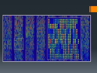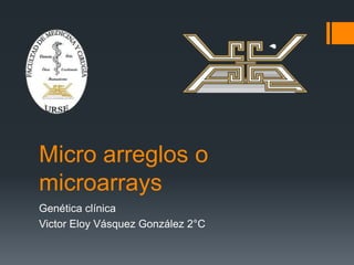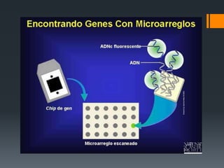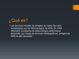 Este documento describe los microarreglos de ADN, también conocidos como chips de ADN. Explica que los microarreglos permiten evaluar la expresión de miles de genes en un pequeño espacio, lo que permite comparar la expresión génica entre células sanas y enfermas. Detalla que los microarreglos consisten en placas con cientos o miles de secuencias de genes inmovilizados que se usan para detectar cambios en la expresión génica y copias de genes entre muestras. Los microarreglos son una importante herramienta de investigación