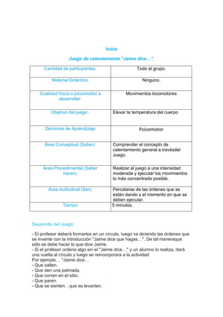 Este documento presenta una planificación de una microclase de educación física que incluye tres juegos: "Jaime dice..." para el calentamiento, "Vaqueros y potros salvajes" para desarrollar coordinación, y "Tiro al cono" para mejorar la puntería. Finaliza con el juego "La papa caliente" para la recuperación cardiovascular y estiramiento muscular. Los juegos involucran a todo el grupo y se enfocan en el desarrollo de habilidades motrices y actitudinales a través de la diversión.