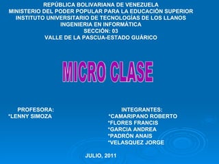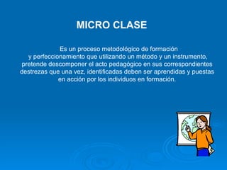 Este documento describe la micro clase como un proceso metodológico para descomponer el acto pedagógico en destrezas que los estudiantes deben aprender y aplicar. Explica que una micro clase tiene objetivos específicos, un contenido organizado sobre un tema, y tres fases: inicio para motivar a los estudiantes, desarrollo para exponer el tema de forma holística, y cierre para consolidar el aprendizaje. Finalmente, menciona que los recursos son medios materiales que apoyan la enseñanza de