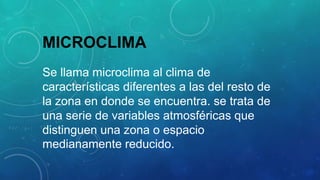 El documento define el microclima como el clima de una zona pequeña que difiere del clima general de la región. Explica que factores como la altitud, latitud y vegetación influyen en el microclima. Luego describe varios tipos de microclimas incluyendo microclimas urbanos, costeros, de montaña y artificiales.