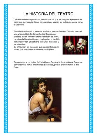 El documento detalla la historia y evolución del teatro desde sus inicios en la prehistoria, pasando por las festividades dionisíacas en Grecia hasta su formalización con grandes dramaturgos como Shakespeare y Lope de Vega. Además, se describen los diferentes géneros teatrales, incluyendo tragedia, comedia y subgéneros como la farsa y el teatro absurdo, y se mencionan importantes teatros y festivales de teatro a nivel mundial. Se enfatiza la importancia de los códigos de comunicación que dan vida a las representaciones teatrales.