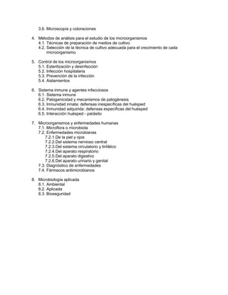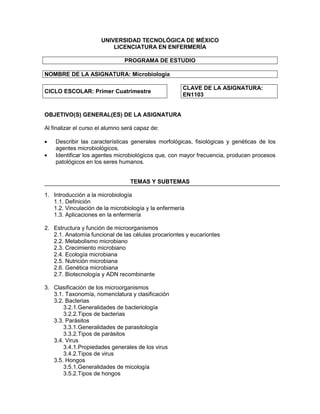 Este documento presenta el programa de estudio de la asignatura de Microbiología para la Licenciatura en Enfermería de la Universidad Tecnológica de México. El objetivo general es que los estudiantes puedan describir las características de los microorganismos y identificar aquellos que causan enfermedades. El programa incluye temas sobre la estructura, clasificación, métodos de análisis, control e interacción con el sistema inmune de los microbios, así como las enfermedades que producen. Se evaluará a los estudiantes