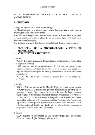 Este documento resume la historia y estado actual de la microbiología en 3 oraciones. Comienza con los orígenes de la microbiología en el siglo XVII con el descubrimiento de los microorganismos por Leeuwenhoek. Luego describe los principales hitos en el desarrollo de la microbiología en los siglos XIX y XX, incluyendo los trabajos de Pasteur y Koch y el descubrimiento de los antibióticos. Finalmente, menciona algunos temas actuales de investigación en microbiología como terapias para enfermedades infeccios