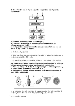 Este documento contiene 11 preguntas de exámenes oficiales sobre microbiología y biotecnología para el segundo curso de bachillerato en Andalucía entre los años 2019-2022. Las preguntas cubren temas como la morfología y función de las estructuras bacterianas, los diferentes tipos de microorganismos y sus usos industriales como la producción de cerveza, yogur y pan, y procesos como la fermentación y la división celular bacteriana. Las preguntas requieren la identificación y descripción de microorganism