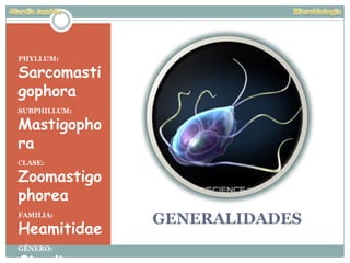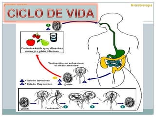 El documento describe el protozoo Giardia lamblia, un parásito microscópico que causa giardiasis, con información sobre su morfología, mecanismos de patogenia y síntomas asociados. Se detalla su diagnóstico, incluyendo métodos como análisis de heces, y los tratamientos disponibles, como albendazol y metronidazol. Además, se menciona la relevancia epidemiológica del parásito en regiones tropicales y en poblaciones vulnerables como los niños.