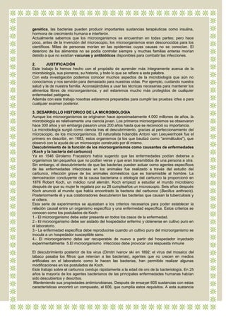Este documento presenta una introducción a la microbiología, describiendo los diferentes tipos de microorganismos y sus roles tanto positivos como negativos. Explica brevemente la historia y desarrollo de la microbiología, desde los primeros descubrimientos microscópicos de van Leeuwenhoek y Fracastoro hasta los criterios de Koch para establecer relaciones causales entre microbios y enfermedades. También cubre aplicaciones de los microorganismos en industrias como la alimentaria, farmacéutica y agrícola.