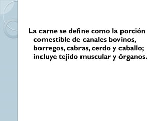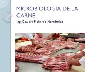 Este documento proporciona información sobre la microbiología de la carne. Resume la composición de la carne, las principales fuentes de contaminación microbiana, los grupos microbianos que se encuentran comúnmente en la carne, las alteraciones causadas por microorganismos y los métodos para controlar la contaminación y conservar la carne de manera segura.