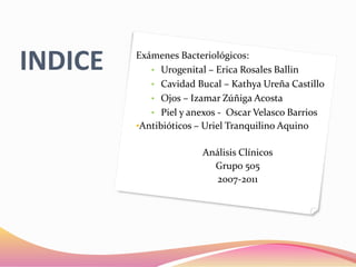 Este documento presenta información sobre exámenes bacteriológicos de diferentes partes del cuerpo como el tracto urogenital, la cavidad bucal, los ojos, la piel y los anexos. Detalla los microorganismos que se encuentran normalmente en cada área, cómo tomar las muestras y los medios de cultivo recomendados. También describe enfermedades comunes causadas por bacterias como la caries, el sarro, impétigo y erisipela.