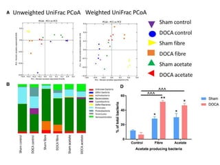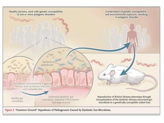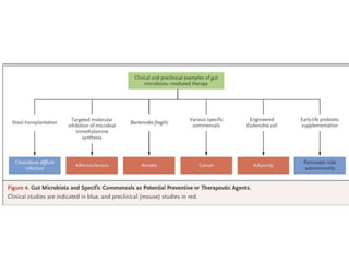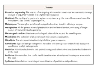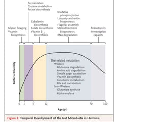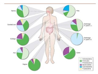 El documento describe el microbioma y su relación con la salud humana. Explica que el microbioma incluye todas las bacterias, arqueas, hongos y virus que viven en un hábitat como el intestino humano. A lo largo de la vida, la composición de la microbiota intestinal cambia y se ha relacionado con trastornos como la alergia y el asma. También se ha demostrado que ciertas dietas, como las altas en fibra, pueden modular la microbiota intestinal y prevenir enfermedades cardiovasculares al aumentar las poblaciones bacter