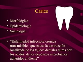 Este documento resume la microbiología de las caries dentales. Explica que las caries son causadas por la acción de ácidos producidos por bacterias en la boca al metabolizar los hidratos de carbono de la dieta. Las bacterias clave implicadas son los estreptococos del grupo mutans, Lactobacillus y Actinomyces, las cuales producen ácido láctico que descalcifica el esmalte y la dentina. El documento también resume los factores etiológicos de las caries según el esquema de Keyes y las teorías micro