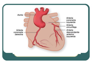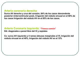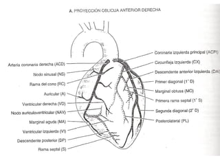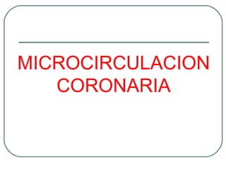 Este documento describe la microcirculación coronaria. Resume que la arteria coronaria derecha irriga el surco AV derecho, la cruz del corazón y la arteria descendente posterior, mientras que la arteria coronaria izquierda irriga las diagonales y las ramas marginales. La sangre drena del corazón a través del sistema superficial y profundo hacia las venas. Factores anatómicos como las arterias epicárdicas, intramurales y los esfínteres precapilares regulan el flujo sanguíneo. Los síndromes coronarios agud