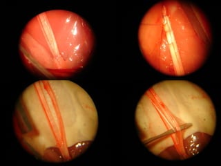 El documento describe técnicas y materiales utilizados en microcirugía, enfatizando la importancia de la responsabilidad, atención y dedicación en el proceso. Se detallan instrumentos específicos y procedimientos prácticos, como la microanastomosis arterial y la disección aorto-cava en diferentes modelos animales. También se discuten los desafíos de la hemostasia en los conejos y ratas, resaltando la precisión necesaria para evitar errores en este tipo de intervenciones.