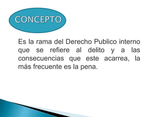 El derecho penal es la rama del derecho público interno que se refiere al delito y a las consecuencias del delito, principalmente las penas. Define los delitos y sanciones que puede establecer el estado, así como el proceso para aplicar las normas penales en casos específicos.