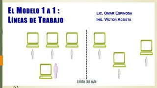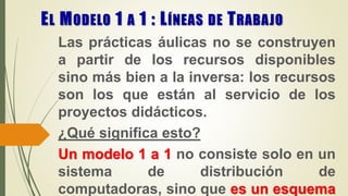 El documento describe las líneas de trabajo de un modelo 1 a 1 en el aula. Explica que un modelo 1 a 1 no se trata solo de distribuir computadoras, sino que es un esquema de trabajo que permite nuevas formas de construir conocimiento. Detalla las etapas por las que pasa un aula al implementar este modelo, desde una exploración inicial de los equipos hasta un uso intensivo de los mismos. También resalta que la integración de las TIC no inhabilita el uso de otros recursos educativos.