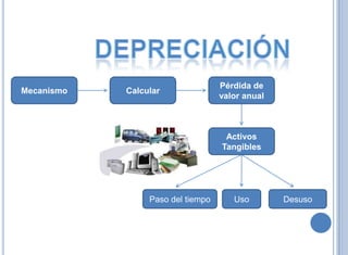 El documento describe los métodos para calcular la depreciación de activos fijos, incluyendo el método de línea recta y métodos decrecientes. Luego presenta un ejemplo numérico para calcular la depreciación anual de una máquina usando el método de línea recta a lo largo de su vida útil de 5 años.