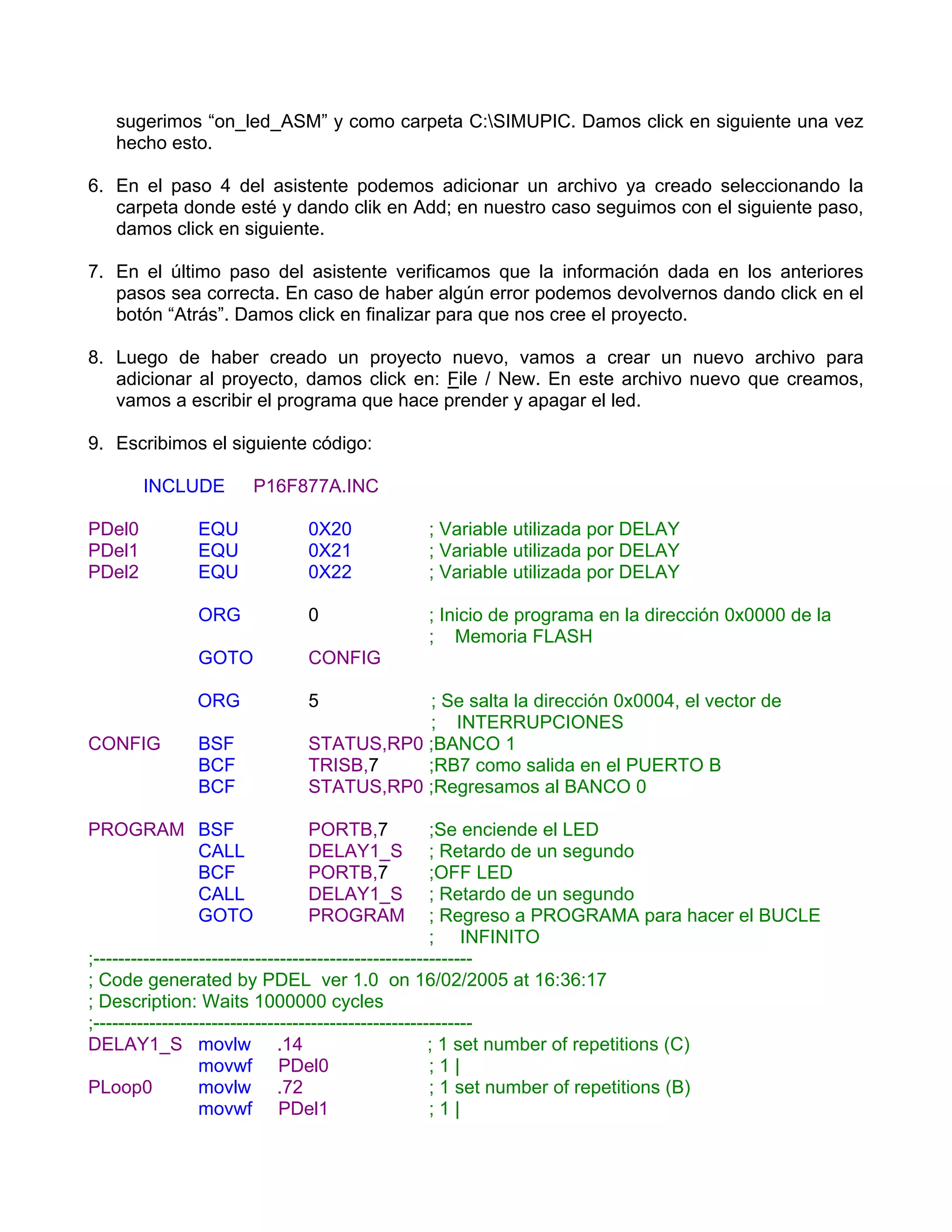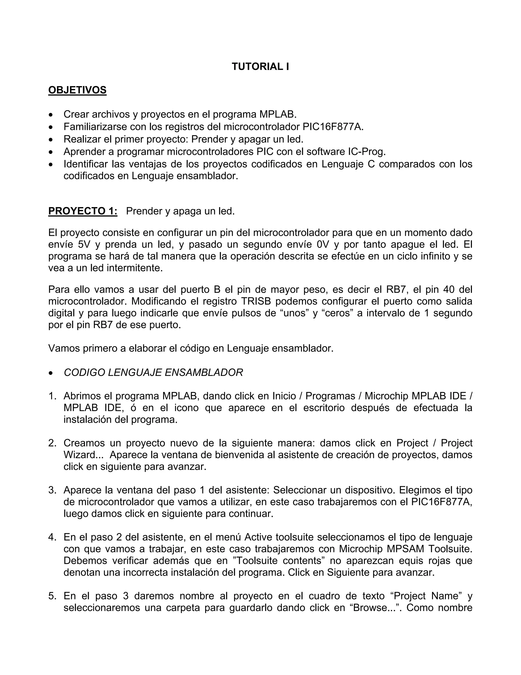 El documento es un tutorial sobre la creación de un proyecto usando el microcontrolador PIC16F877A para encender y apagar un LED. Se explica cómo utilizar el software MPLAB para desarrollar el código en ensamblador y C, además de las configuraciones necesarias para compilar y programar el microcontrolador. También se incluyen instrucciones para manejar errores comunes durante la programación y el uso del IC-Prog para la programación del dispositivo.
