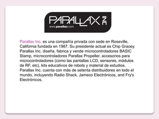 Parallax Inc. diseña y vende microcontroladores como el BASIC Stamp y el Propeller. El BASIC Stamp es un pequeño computador que ejecuta programas en lenguaje PBASIC, mientras que el Propeller posee ocho procesadores internos que pueden ejecutar tareas de forma independiente o cooperativa. Ambos microcontroladores son utilizados en aplicaciones como electrónica industrial, robótica y adquisición de datos.