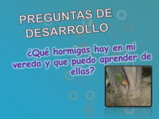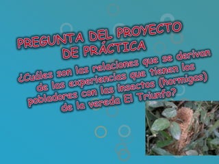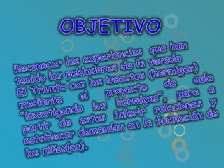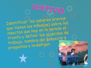 Los niños participaron en un conversatorio para compartir sus conocimientos previos sobre los insectos de su vereda. Nombraron varios insectos que los han picado o molestado, como hormigas, avispas y cucarrones. Luego eligieron trabajar específicamente sobre las hormigas debido a su abundancia. Trabajaron en grupos para crear historias e imágenes sobre las hormigas y otros insectos. Finalmente acordaron reglas para trabajar juntos de manera colaborativa y productiva en el proyecto sobre las hormigas.