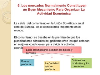 El documento discute varios temas económicos clave. Explica que el comercio mejora el bienestar de ambas partes al permitir la especialización. Luego describe cómo los mercados normalmente organizan de manera efectiva la actividad económica a través de los precios. Finalmente, reconoce que el estado a veces debe intervenir para corregir fallas de mercado, lograr equidad y mejorar los resultados generales.