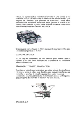 Este documento describe diferentes técnicas y equipos de microfilmación. Explica que la microfilmación permite fotografiar documentos y obtener pequeñas imágenes en películas. Detalla los principales tipos de equipos de microfilmación, incluyendo microfilmadores planetarios y rotativos, así como cámaras repetidoras y procesadores. También cubre normas legales relacionadas con el uso de microfilmación y digitalización de documentos.