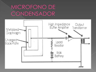 Este documento describe los diferentes tipos de micrófonos, incluyendo micrófonos dinámicos, de condensador, de cinta, piezoeléctricos y sus características. Explica cómo funcionan cada uno y sus ventajas y desventajas. También cubre el uso de diferentes tipos de micrófonos como micrófonos de mano, de estudio, lavallave, parabólicos y más. Finalmente, discute las características electroacústicas como respuesta a transitorios, sensibilidad, respuesta de frecuencia y patrones