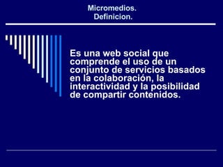 El documento describe los micromedios, que son servicios basados en la colaboración, interactividad y compartir contenido. Menciona que los blogs, podcasts y videocasts son ejemplos comunes de micromedios. Explica que los micromedios permiten publicar contenido fácilmente sin necesidad de conocimientos técnicos avanzados y ofrecen interacción con otros usuarios. También destaca ventajas como mejor cobertura local, diálogo con audiencias y protagonismo de la población, pero señala posibles desventajas como mal uso de internet