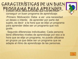 Este documento describe las características de un buen programa de aprendizaje y diferentes recursos audiovisuales que pueden usarse en la enseñanza. Identifica once características clave de un programa de aprendizaje efectivo, como la motivación, las diferencias individuales, los objetivos claros y la práctica repetida. También explica brevemente los tutoriales, simulaciones, videos de YouTube y Second Life como herramientas potenciales para mejorar la enseñanza.