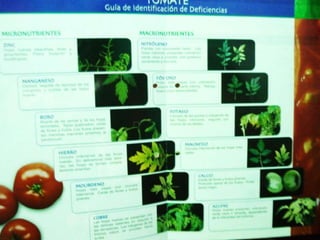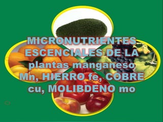 El documento describe las funciones del manganeso en las plantas. El manganeso participa en numerosos sistemas enzimáticos como la superóxido dismutasa y la fotosíntesis. Regula el metabolismo de los ácidos grasos y activa el crecimiento de las plantas. Los síntomas de deficiencia incluyen clorosis en hojas jóvenes.