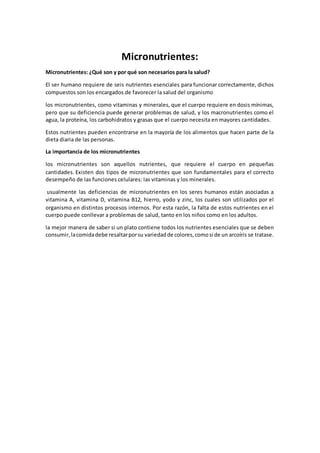 Los micronutrientes como vitaminas y minerales son nutrientes que el cuerpo requiere en pequeñas cantidades pero cuyas deficiencias pueden generar problemas de salud. Existen dos tipos principales de micronutrientes: vitaminas y minerales, los cuales desempeñan funciones celulares esenciales. Las deficiencias más comunes en humanos incluyen la vitamina A, D, B12, hierro, yodo y zinc, los cuales son utilizados en diversos procesos internos, por lo que su falta puede afectar la sal