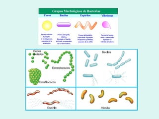 El documento describe los diferentes tipos de microorganismos, incluyendo bacterias como cocos, bacilos, vibrios y espiroquetas, así como virus como adenovirus, VMT, VIH y bacteriófagos. También cubre protoctistas como algas unicelulares, diatomeas, paramecios, vorticelas y amebas, así como hongos como levaduras, mohos Penicillium y mohos Rhizopus.