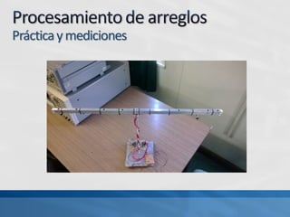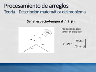 Este documento describe un proyecto de investigación sobre el procesamiento de señales de arreglos de sensores. El objetivo es estudiar algoritmos de procesamiento de arreglos para aplicarlos al procesamiento de señales de audio de banda ancha, simular el funcionamiento de un arreglo e implementar un micrófono direccional usando múltiples micrófonos omnidireccionales.