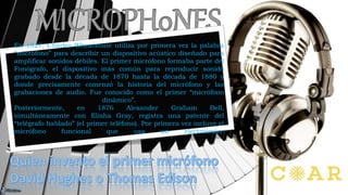 El término 'micrófono' fue utilizado por primera vez en 1827 por Charles Wheatstone para describir un dispositivo que amplifica sonidos débiles. A lo largo de la historia, se han desarrollado diversos tipos y modelos de micrófonos, comenzando con el de carbono en 1877 y culminando en innovaciones modernas como micrófonos ópticos y micrófonos inspirados en la biología, como el oído de la mosca ormia. Estos dispositivos son cruciales en la grabación y reproducción de sonido, con los micrófonos dinámicos y de condensador siendo los más populares en la actualidad.