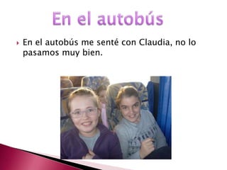 Eva fue de excursión con Claudia en autobús, donde pasaron un buen rato. Antes de ir a Micropolix, se tomaron una foto. En Micropolix, Eva condujo un coche, un avión y un barco, pero no lo pasaron muy bien. Comieron rápido para subir al barco. Tampoco lo pasaron súper bien en la sala de juegos.