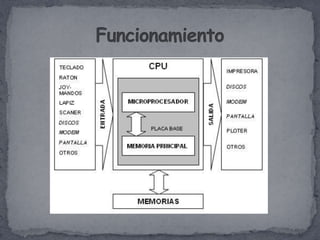 Este documento describe la historia y el funcionamiento de los microprocesadores. Comienza explicando que el microprocesador es el circuito central de una computadora y actúa como su "cerebro". Luego resume los hitos más importantes en el desarrollo de los microprocesadores desde 1971 hasta la actualidad, incluyendo el primer microprocesador creado por Intel y los avances posteriores. Finalmente, explica a alto nivel cómo funcionan los microprocesadores y sus componentes principales como los registros, la unidad de control y la memoria.