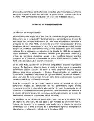 El documento describe la historia y evolución de los microprocesadores desde el primero, el Intel 4004 de 1971, hasta los procesadores modernos. Explica que el microprocesador surgió de la fusión de las tecnologías de computación y semiconductores a principios de los años 70, permitiendo integrar todos los componentes de una CPU en un solo circuito integrado. También destaca hitos como el Intel 8086 de 1978 que introdujo la arquitectura x86 aún usada hoy en día y el éxito del Intel 8088 en los primeros PC de IBM.