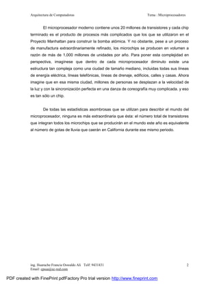 El documento describe la evolución de los microprocesadores. Explica que el 8088/8086 fueron los primeros microprocesadores de 16 bits lanzados por Intel en 1978/1979. Luego, el 80286 de 1984 introdujo la memoria virtual y permitió direccionar hasta 16 MB de RAM. Finalmente, el 80386 DX de 1985 expandió los buses a 32 bits y permitió direccionar hasta 4 GB de memoria física.