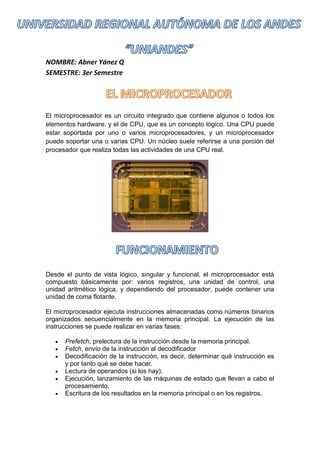 El documento describe las partes principales de un microprocesador, incluyendo registros, unidad de control, unidad aritmético lógica, memoria caché y puertos. Explica que un microprocesador ejecuta instrucciones almacenadas en la memoria principal en varias fases como prefetch, fetch, decodificación, lectura de operandos, ejecución y escritura de resultados. También compara la arquitectura de un microprocesador con la de una computadora digital.