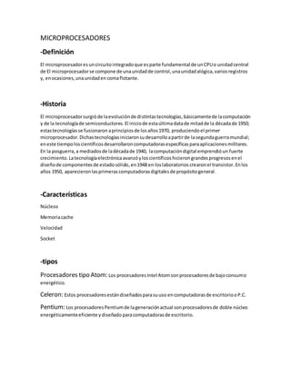 El microprocesador es un circuito integrado fundamental de la CPU que se compone de una unidad de control, lógica, registros y en ocasiones una unidad de coma flotante. Surge de la evolución de las tecnologías de computación y semiconductores desde la década de 1950, produciéndose el primer microprocesador a principios de los 70. Los microprocesadores varían en características como núcleos, memoria cache, velocidad y zócalo, e incluyen tipos como Atom, Celeron, Pentium, Core