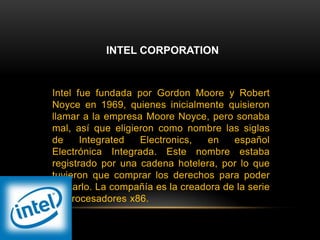 El documento describe la historia y características de los principales microprocesadores de Intel y AMD. Se explica que el microprocesador es la parte de la computadora que ejecuta los programas y se detallan los primeros chips desarrollados por Intel como el 4004 en 1971 y modelos posteriores como el 8086, 80386, 80486 y la serie Pentium. También se mencionan los procesadores producidos por AMD y sus esfuerzos por competir con Intel.