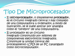 Este documento describe el microprocesador, incluyendo su historia, características, funcionamiento y proceso de fabricación. Resume que el microprocesador es el componente central de una computadora, ha evolucionado desde los primeros circuitos integrados en los años 70, y su fabricación involucra un complejo proceso que comienza con la creación de un monocristal de silicio.