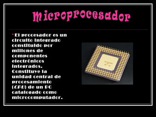 El microprocesador es un circuito integrado que constituye la unidad central de procesamiento (CPU) de una computadora. Está compuesto de millones de componentes electrónicos integrados que realizan operaciones aritméticas, lógicas y de control para ejecutar programas. La velocidad del microprocesador se mide en función de la frecuencia de su reloj y el número de operaciones por ciclo. El primer microprocesador fue creado por Intel en 1971 para una calculadora y contenía 2,300 transistores, mientras que modelos posteriores como el