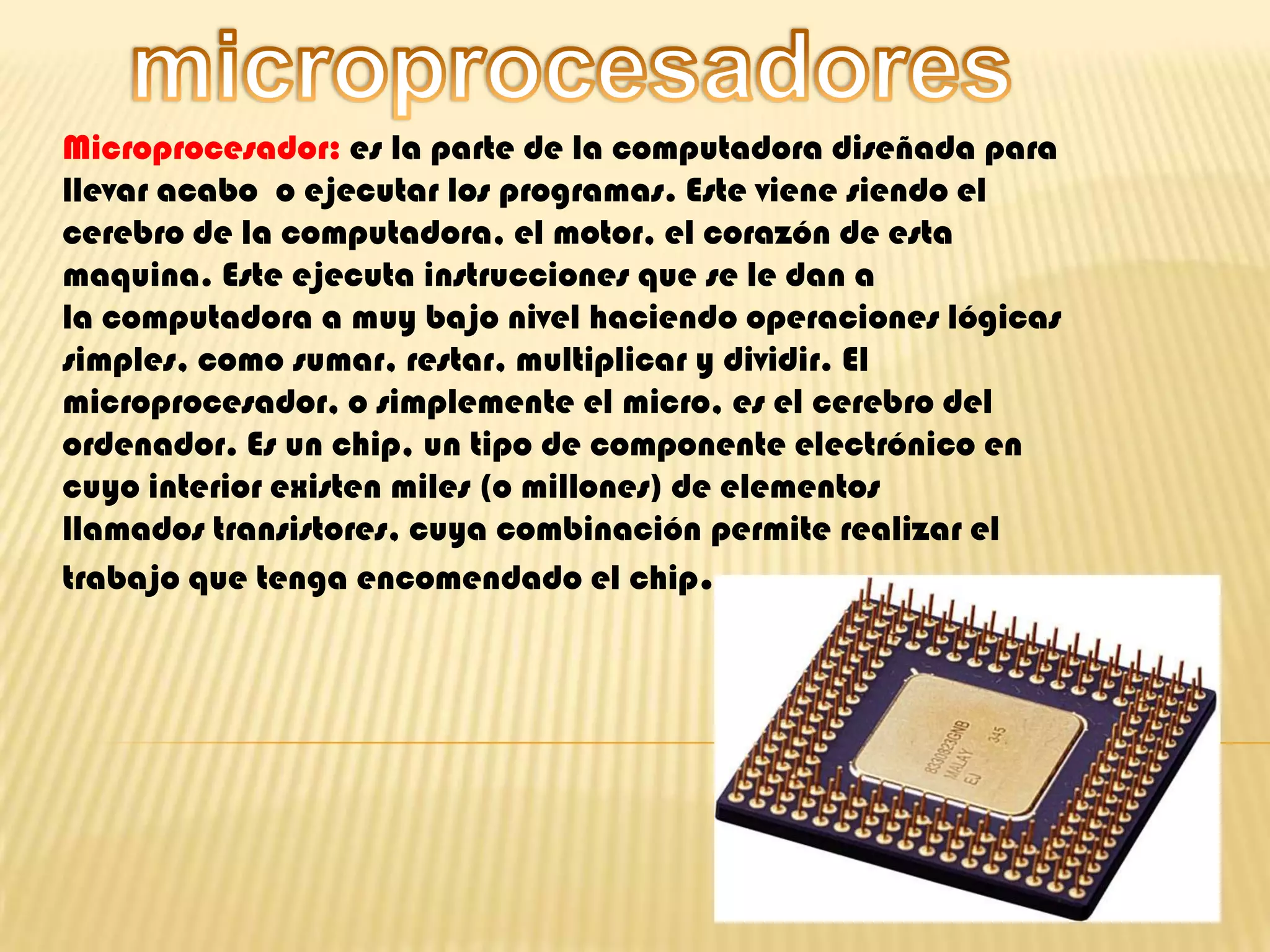 El documento describe la evolución de los microprocesadores, desde los primeros modelos de 8 y 16 bits hasta los modernos de 32 y 64 bits. Explica las características clave de los microprocesadores antiguos como la velocidad y el bus de datos, así como las partes fundamentales de cualquier microprocesador como la memoria cache, los registros y la unidad de control. También analiza modelos específicos como el Pentium MMX de Intel y el AMD K6, destacando sus fortalezas y mejoras con respecto a generaciones anteriores.
