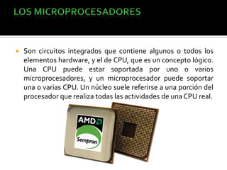 El documento describe la historia y el funcionamiento de los microprocesadores. Explica que el primer microprocesador, el Intel 4004 de 1971, contenía 2,300 transistores y podía realizar 60,000 operaciones por segundo. También describe los componentes clave de un microprocesador, incluyendo registros, una unidad de control y una unidad aritmético-lógica. Finalmente, menciona algunos modelos importantes de microprocesadores como el 8088, 80286, Pentium y Core 2 Duo.
