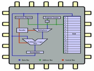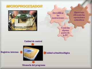 Este documento describe las partes principales de un microprocesador, incluyendo la unidad aritmético/lógica, la unidad de control, la memoria del programa y los registros internos. Explica que los registros internos son áreas de almacenamiento dentro del procesador usadas para almacenar datos durante la ejecución de instrucciones y que incluyen el registro acumulador, el contador del programa y el registro de instrucciones.