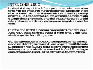 El documento describe la evolución de los microprocesadores Intel Core desde el Core 2 Duo de dos núcleos hasta el más reciente Core i7 Extreme Edition de ocho núcleos. Explica que el Core 2 Duo puede procesar dos tareas simultáneamente de forma nativa, a diferencia de procesadores anteriores que usaban multiprogramación. Luego presenta el Core 2 Quad de cuatro núcleos y el Core Extreme de cuatro núcleos de alto rendimiento. Finalmente, detalla las características clave del Core i7 como el uso exclusivo de memorias