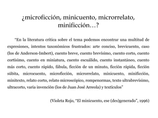 El documento presenta diferentes definiciones y puntos de vista sobre qué es un microrrelato. Varios autores coinciden en que un microrrelato debe ser muy breve y tener una estructura narrativa, aunque no necesariamente sea solo un cuento breve. También deben presentar una progresión dramática y lograr una unidad de efecto a pesar de su brevedad. No hay consenso sobre si el microrrelato constituye su propio género o es simplemente una variante muy breve del cuento.