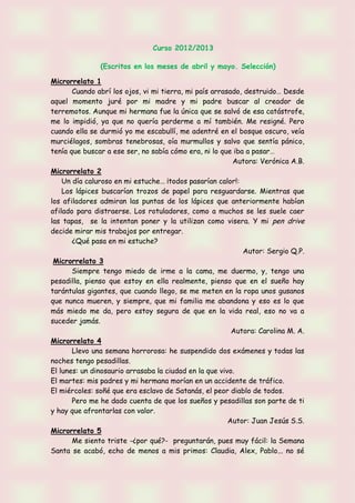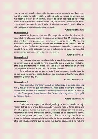 Este documento contiene 15 microrrelatos de diferentes autores. Los microrrelatos tratan sobre temas como sueños, miedos, recuerdos, imaginación y la conciencia. Algunos microrrelatos cuentan historias sobre encuentros con seres míticos o sobre cómo se siente el autor al ser otras criaturas como un gato o un pájaro.